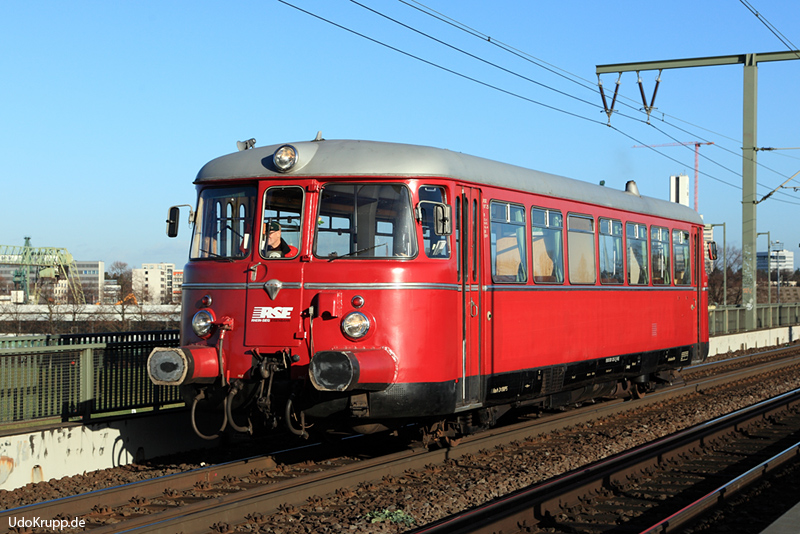301 025 der RSE passiert am 08.01.2016 die Kölner Südbrücke. Der Dieseltriebwagen wurde von MAN in Nürnberg im Jahr 1960 unter der Fabriknummer 145166 gefertigt. Indienststellung erfolgte am 02.06.1960...