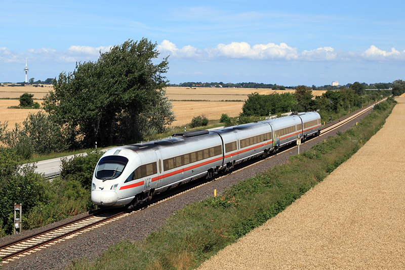 605 011 hat am 09.08.2013 den Bahnhof Puttgarden verlassen und wird in Kürze die Fehmarnsundbrücke passieren
