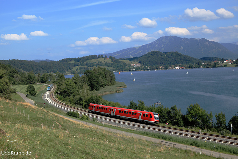 612 080 passiert am 15.08.2013 den Alpsee bei immenstadt. Im Hintergrund ist der Grünten zu sehen